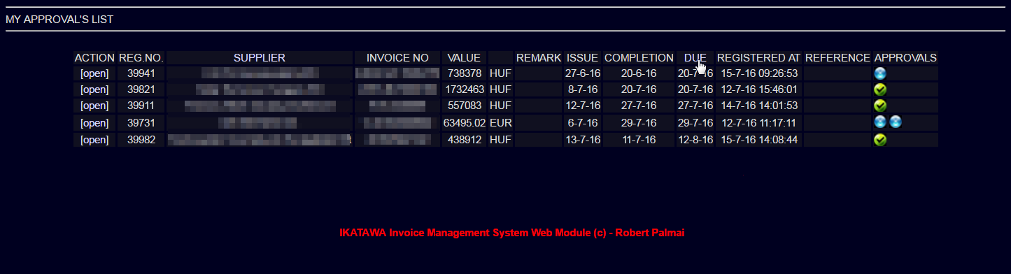 [IKATAWA] Invoice register and workflow Features: -Grouping, regrouping, rotating invoice pages -Creates automatically template approval chain for vendors -Generation of rejection letter if invoice is not accepted -Web based approvals -Email notification with url link to invoice -Web based reports -Browse online the invoices grouped by approver or by vendor -Daily emails to accountants about newly approved invoices -Weekly TOP5 users with overdue invoices -Symmetric or chain approvals -Lightweight opensource database server (3 years / 50.000 invoices are less than 100 mbyte) -No client installation needed -And much much more..
