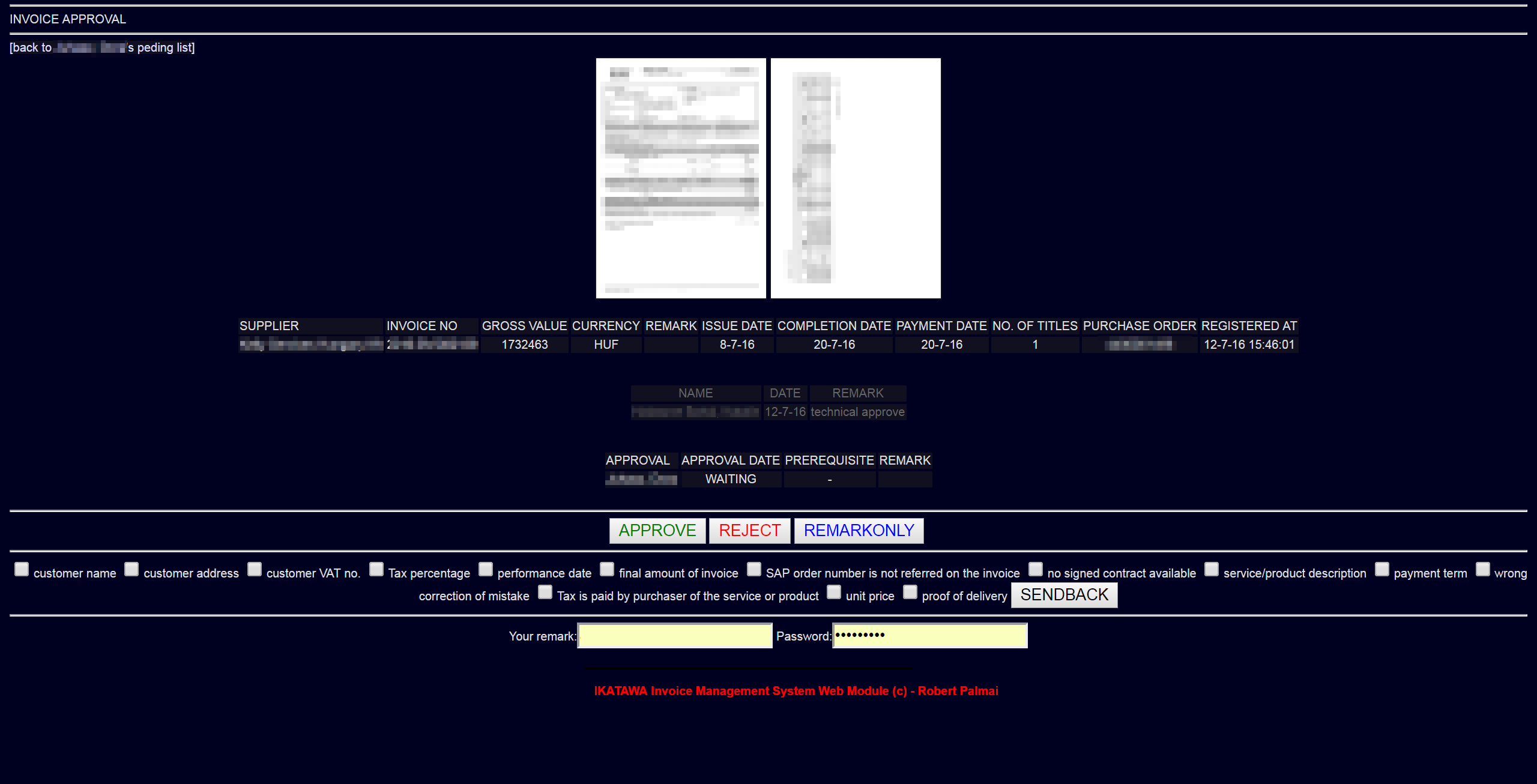 [IKATAWA] Invoice register and workflow Features: -Grouping, regrouping, rotating invoice pages -Creates automatically template approval chain for vendors -Generation of rejection letter if invoice is not accepted -Web based approvals -Email notification with url link to invoice -Web based reports -Browse online the invoices grouped by approver or by vendor -Daily emails to accountants about newly approved invoices -Weekly TOP5 users with overdue invoices -Symmetric or chain approvals -Lightweight opensource database server (3 years / 50.000 invoices are less than 100 mbyte) -No client installation needed -And much much more..